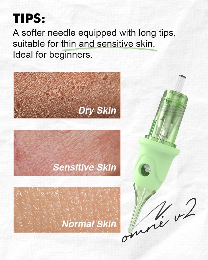 A OMNI V2 Cartridge Needle combina uma empunhadura de silicone ultra macio com uma firmeza delicada e controlada, sendo perfeitamente indicada para trabalhos de sombra, design de sobrancelhas e procedimentos labiais. Desenvolvida especialmente para peles finas e sensíveis.