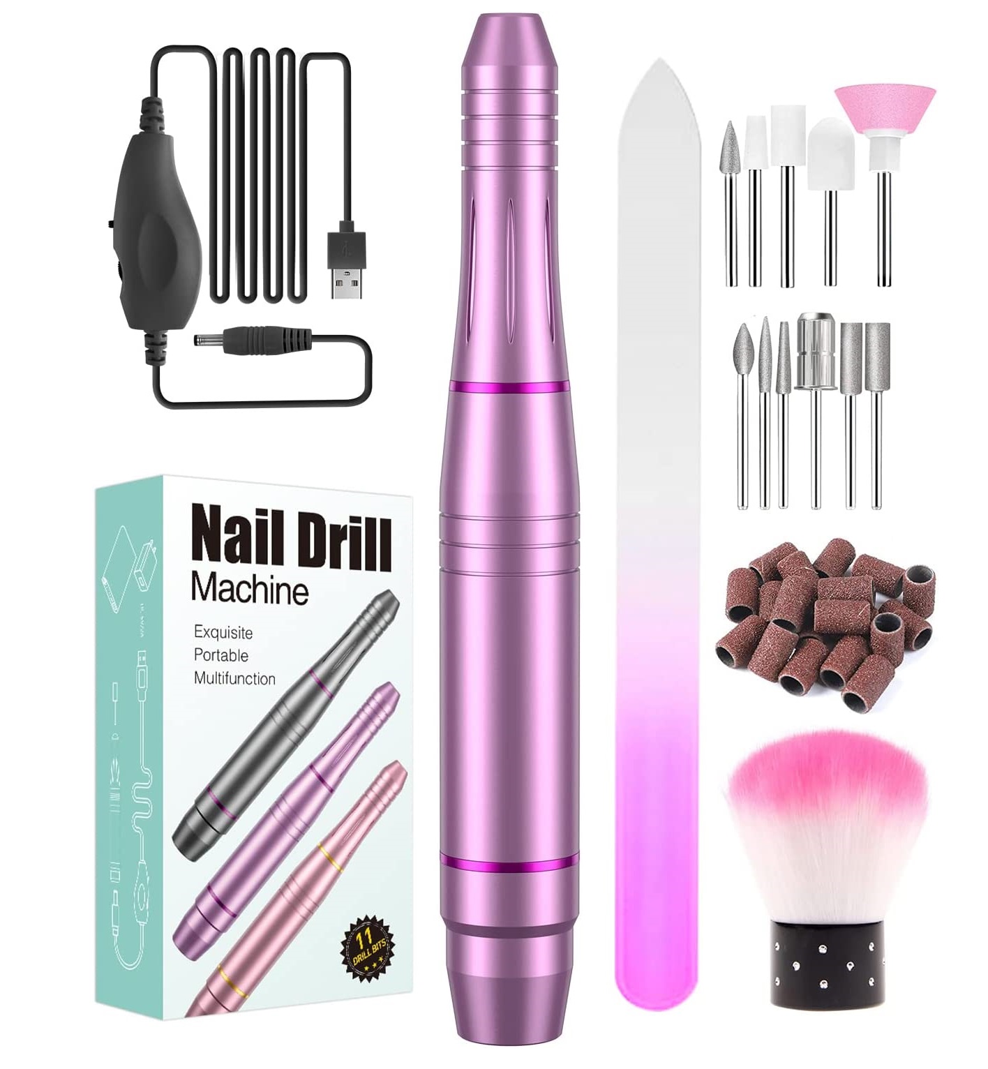 O kit de manicura elétrico equipado com um cabo de carregamento USB.