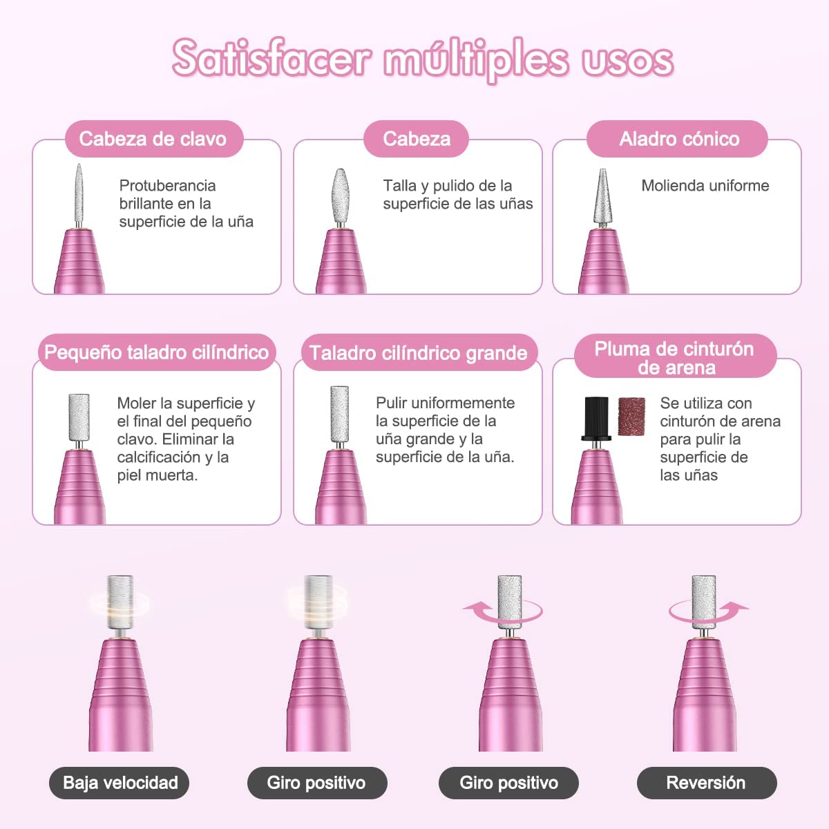 Velocidade e direção ajustáveis: com o botão de controlo de velocidade, pode ajustar a velocidade de 0 RPM a 20000 RPM para facilitar o polimento. Os interruptores frontais e traseiros flexíveis são adequados para utilizadores canhotos e destros, facilitando o uso com brocas de unhas. É fácil remover a tinta sem danificar as unhas.