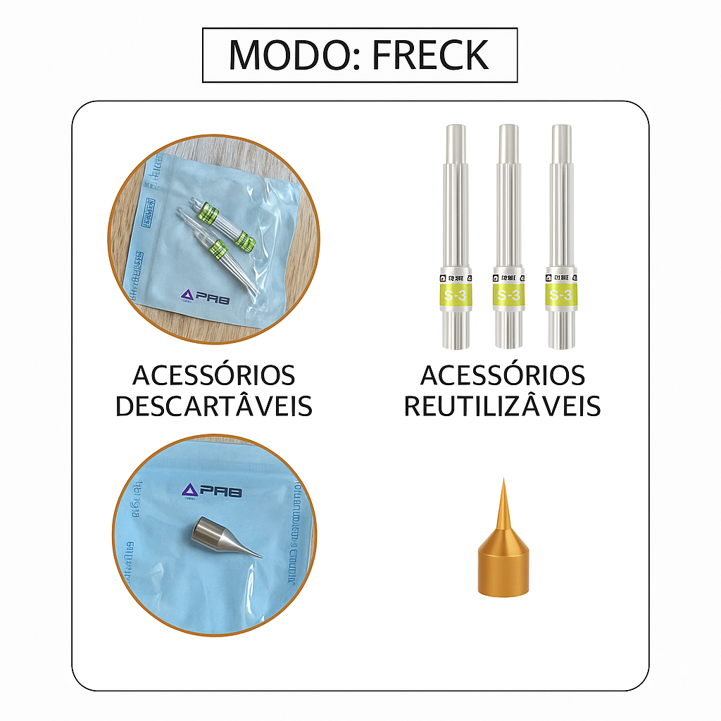 - Segurança: não necessita contacto direto com a pele; inclui 2 tipos de agulhas substituíveis e 3 cabeças de ozono para esterilização e tratamento de acne.