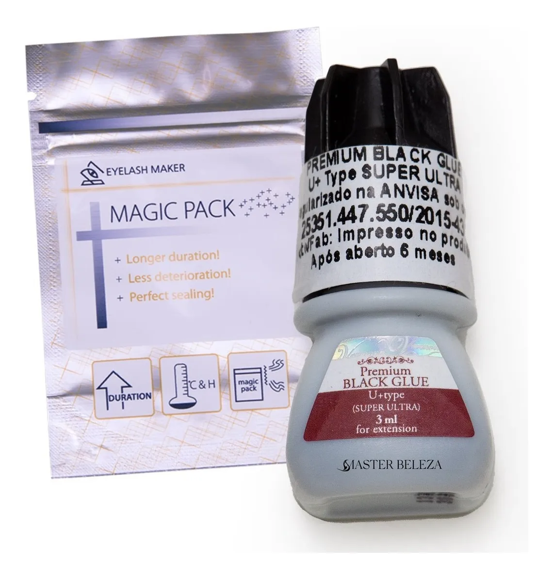 A cola premium black glue U+ type super ultra é popular para extensão fio a fio. Com tempo de secagem de 5 a 8 segundos, é recomendada para técnicos intermediários. Disponível na cor preta em tubo de 3ml, proporciona ótimo rendimento e aproveitamento.