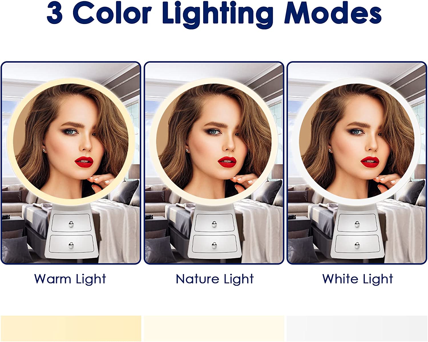 Espelho com 46 LEDS e 3 cores de luzes: Pressionar prolongadamente o botão inteligente pode ajustar a intenção da luz. Tem três cores de luz: branco frio, natural e quente.