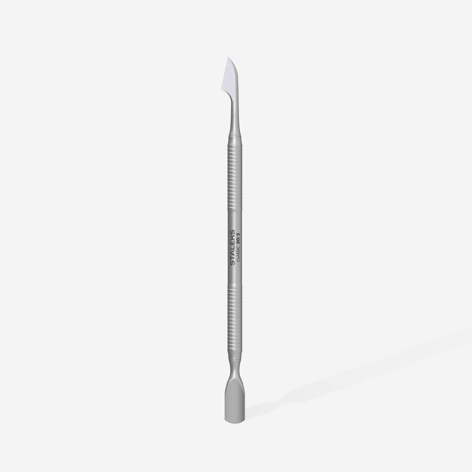 A espátula Staleks Classic 30 Tipo 2 é uma ferramenta profissional de manicure com duas partes funcionais — um pusher arredondado e uma machadinha — projetadas para precisão e conforto durante o trabalho.