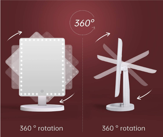 Rotação de 360 graus: o espelho de maquilhagem LED no seu balcão pode ser girado para cima e para baixo em 90 graus e uma rotação envolvente de 360 graus, fácil de encontrar o ângulo de visão perfeito sem esforço. O design do suporte desmontável torna-o num espelho de maquilhagem portátil com luz.
