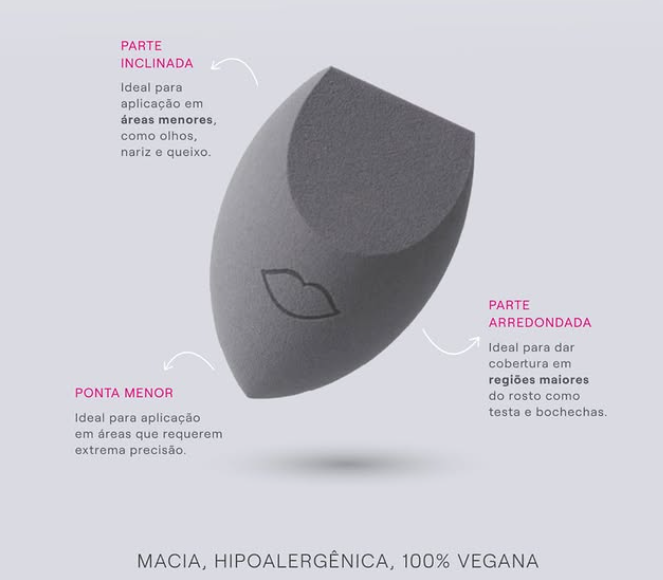 A Esponja foi desenvolvida para oferecer uma aplicação impecável e um acabamento profissional, com textura macia e poros fechados que garantem uma cobertura uniforme e econômica. Seu design com ponta de precisão proporciona um acabamento perfeito, seja para aplicação de base, corretivo ou contorno.