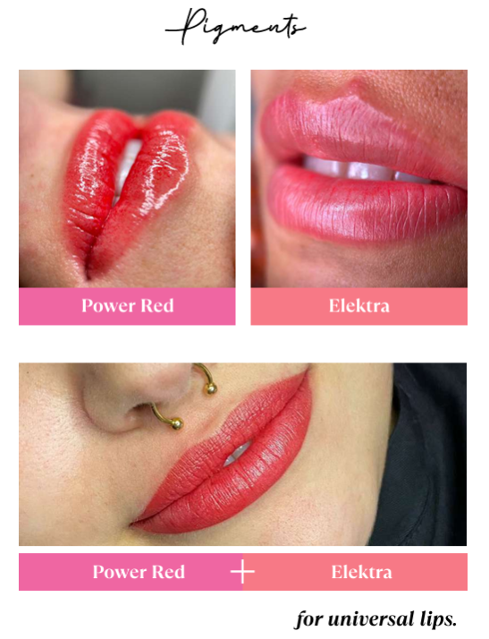 O pigmento Elektra tem cor vermelho/rosa/coral intenso. Pigmento indicado para lábios pálidos, rosados e frios intensidade baixa e média. Para técnicas de micropigmentação labial e Nano Lips.