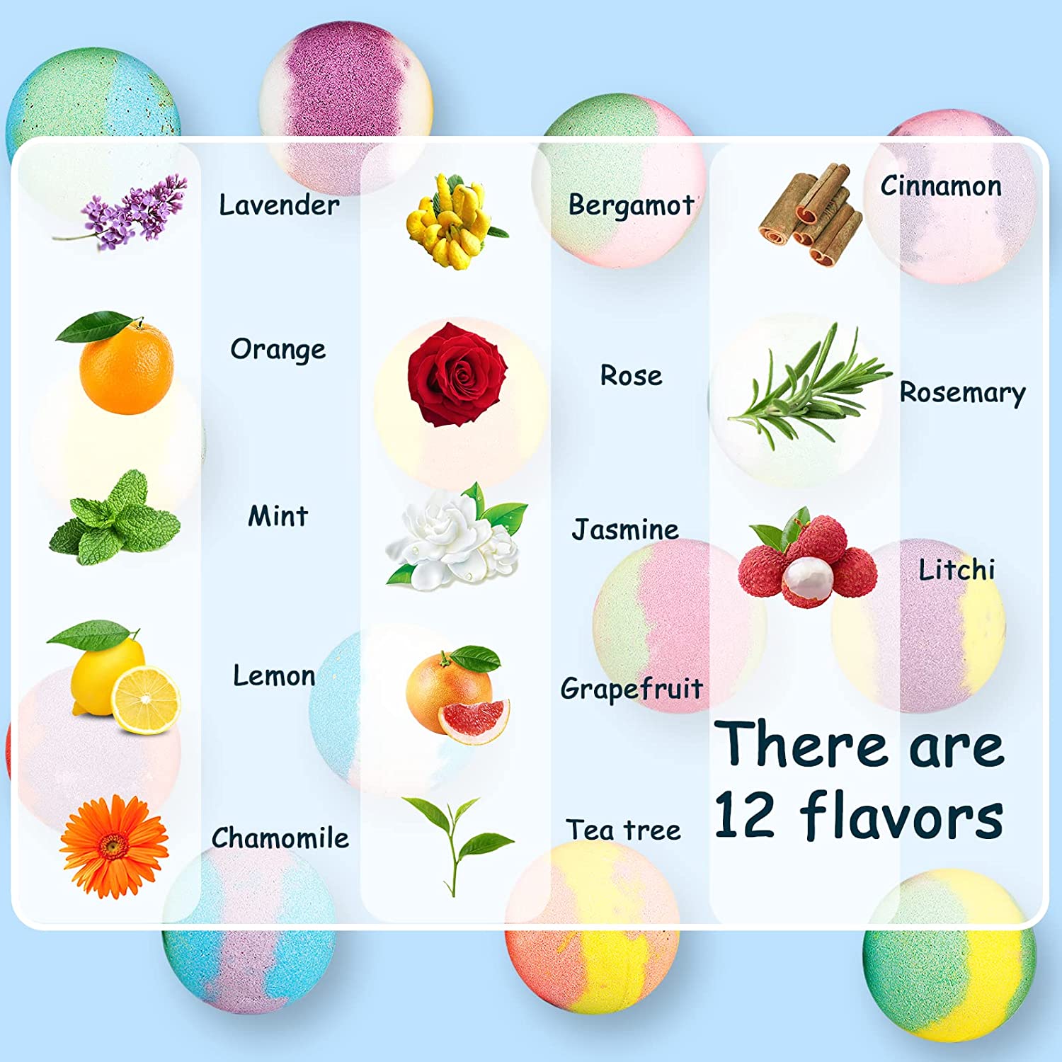 O kit de bombas de banho de spa contém 14 cores e sabores diferentes que incluem lavanda, laranja, menta, limão, camomila, toranja, árvore do chá, bergamota, rosa, alecrim, canela, jasmim, baunilha, lichi.