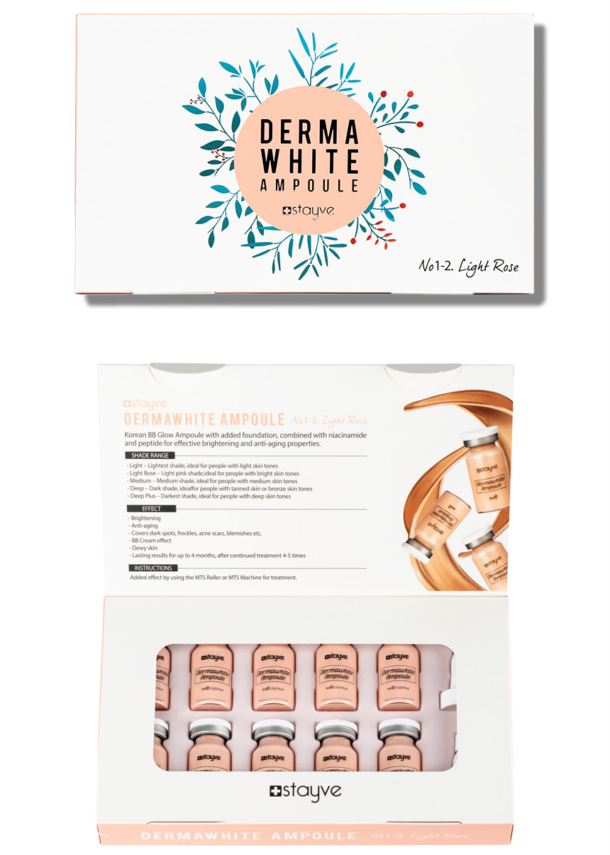 No. 1-2 Light Rose - este é um tom claro ideal para pessoas com tons de pele claros com tons de rosa. É adequado para pessoas com pele mais rosada. O soro BB Glow Stayve Dermawhite foi desenvolvido para clarear sua pele de forma segura e intensa. É adequado para todos os tipos e tons de pele. Ajuda a reduzir o aparecimento de sardas e a descoloração da pele causadas pelo fotoenvelhecimento e acne.As ampolas contêm base adicionada, combinada com niacinamida e peptídeo para um processo eficaz de clareamento e anti-envelhecimento. Eles permitem a hidratação instantânea da pele, deixando a sensação de pele macia e carnuda. Este tratamento é perfeito para peles secas e danificadas pelo sol, tons de pele pigmentados e desiguais, peles cansadas e sensíveis que requerem hidratação intensa. O soro BB Glow é penetrado sob a pele usando um dispositivo de microagulhas com agulhas de 0,25 mm a 1 mm. Após a penetração, as ampolas de BB cream injetadas na pele irão se misturar e se ajustar ao tom de pele do cliente.