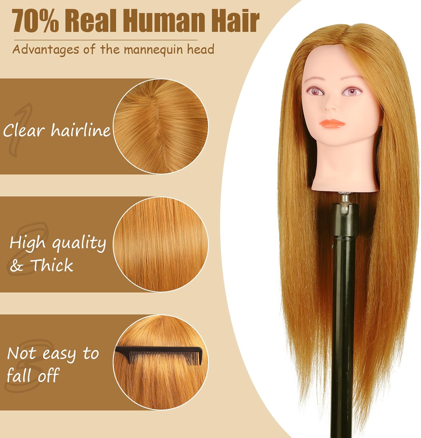 Cabelo de 70% real: 70% cabelo real parece macio. A cabeça do cabeleireiro pode ser usada para pentear, pode ser usada com ferro e ondulador