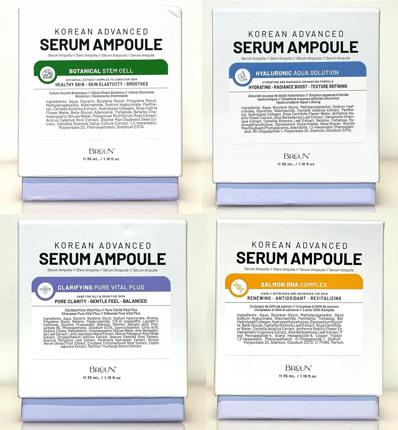 Com base nas imagens enviadas, este conjunto trabalha com quatro boosters distintos da linha Korean Advanced Serum Ampoule, cada um orientado para uma necessidade diferente da pele: Botanical Stem Cell, Hyaluronic Aqua Solution, Clarifying Pure Vital Plus e Salmon DNA Complex.