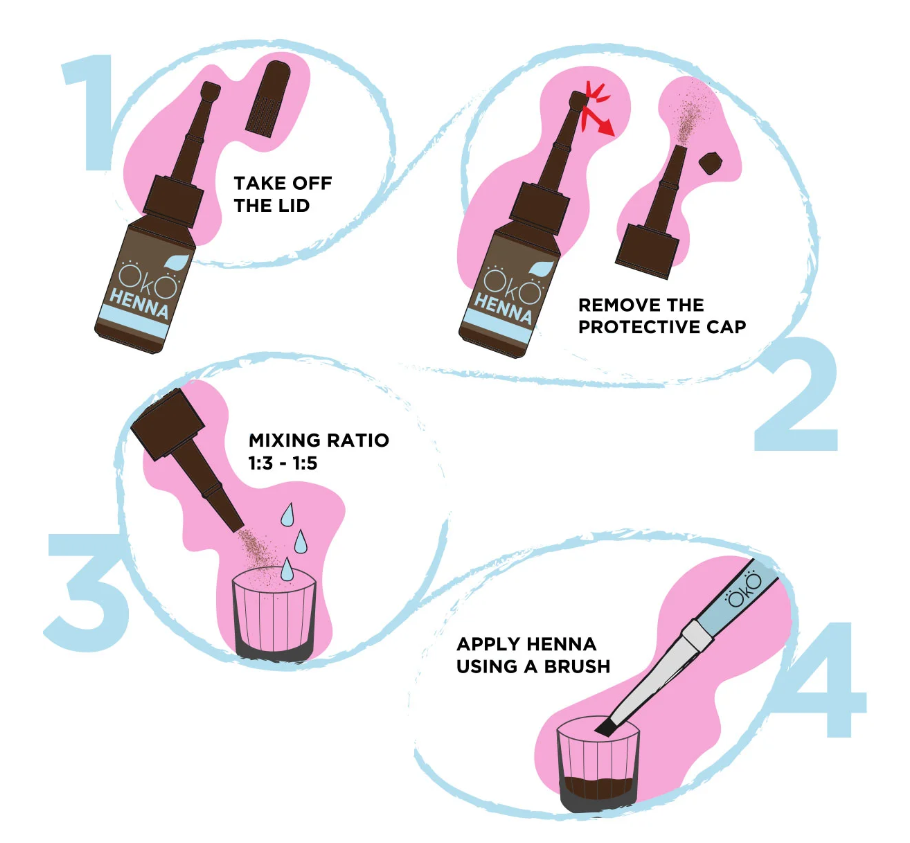 - Misture a henna com água destilada ou solução mineral (proporção 1:3 até 1:5) em recipiente não metálico até obter consistência semelhante à de molho de soja.