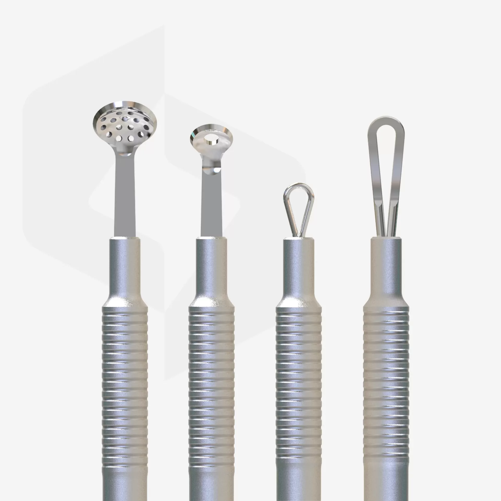 - Um conjunto de três utensílios para a limpeza mecânica da pele.