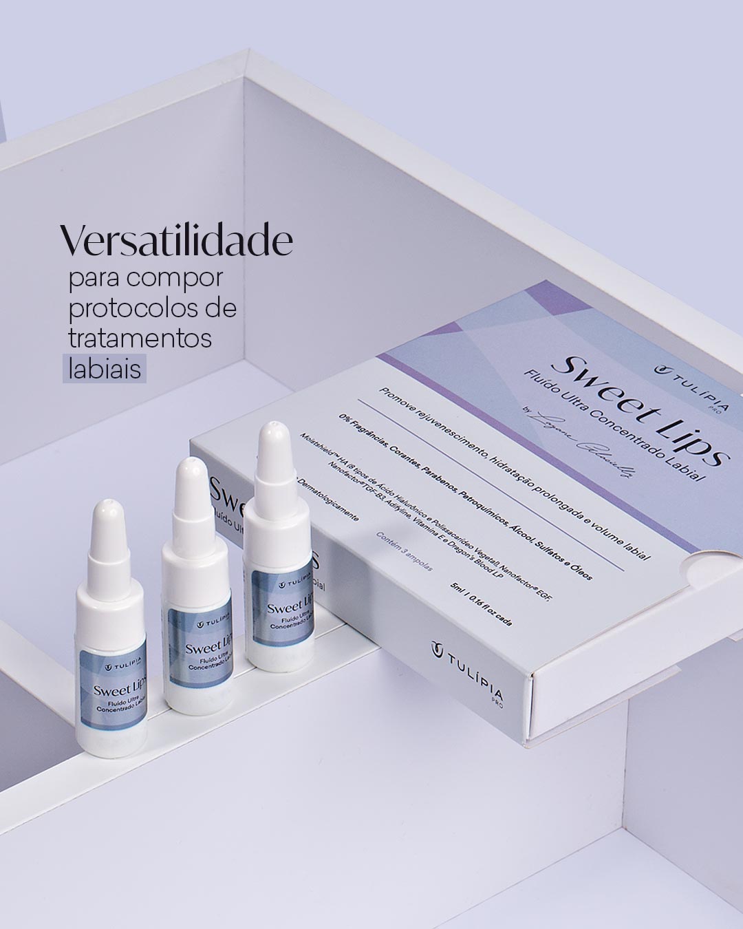 Ideal para técnicas de microagulhamento, o Fluido Ultra Concentrado Labial Sweet Lips possui 8 tipos de Ácido Hialurônico e Fatores de Crescimento em sua composição, capazes de se conectarem às diferentes camadas da pele, promovendo hidratação, volume e rejuvenescimento labial.