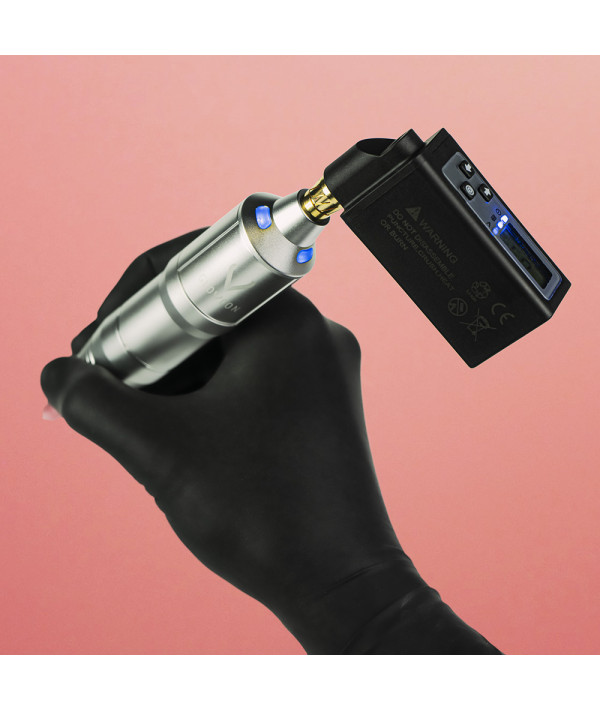 Uma revolução absoluta no fornecimento de máquinas de tatuagem. Esta fonte de alimentação de pequeno porte com uma bateria potente é montada diretamente na máquina, na tomada RCA, graças à qual os cabos não atrapalham o trabalho, e o mais importante é que não temos que protegê-los com papel alumínio. Seu peso também é pequeno - apenas 44 gramas! Praticamente imperceptível na máquina.