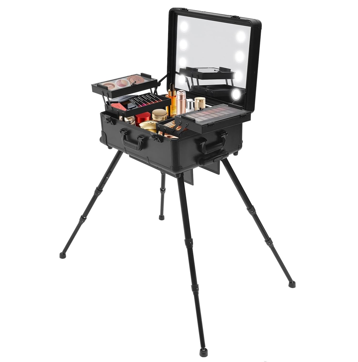 Tenha o seu próprio camarim onde quer que vá. Esta mala trolley profissional foi pensada para quem precisa de transportar todo o material de trabalho com organização, segurança e apresentação impecável perante o cliente. Combina a robustez de uma estrutura em liga de alumínio com o conforto de um espelho iluminado por LED, tornando-se a ferramenta ideal para serviços móveis, eventos, sessões fotográficas, casamentos e trabalho em salão.