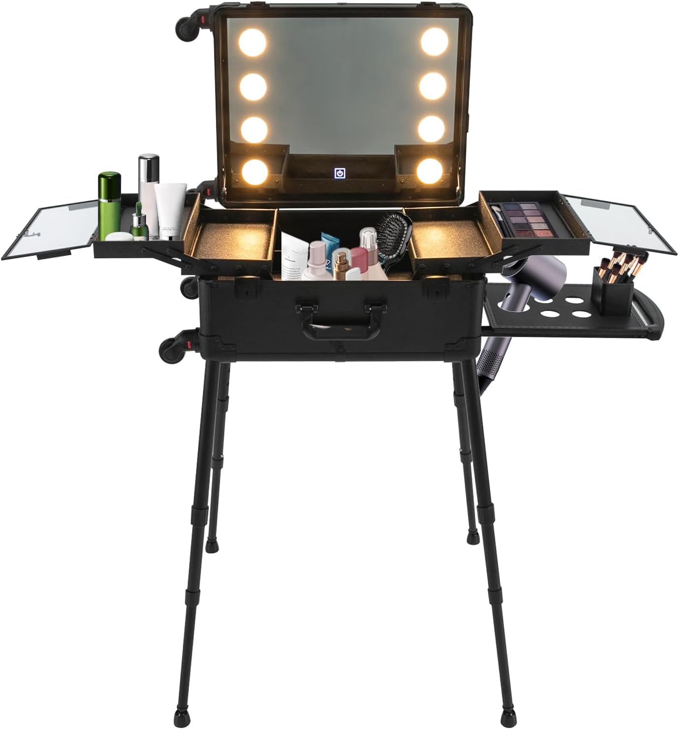 Maleta camarim portátil com iluminação LED ajustável, espelho profissional, altura regulável e fechadura de segurança. Ideal para maquilhadores, cabeleireiros, barbeiros, esteticistas, lash designers e tatuadores que trabalham ao domicílio ou em estúdio.
