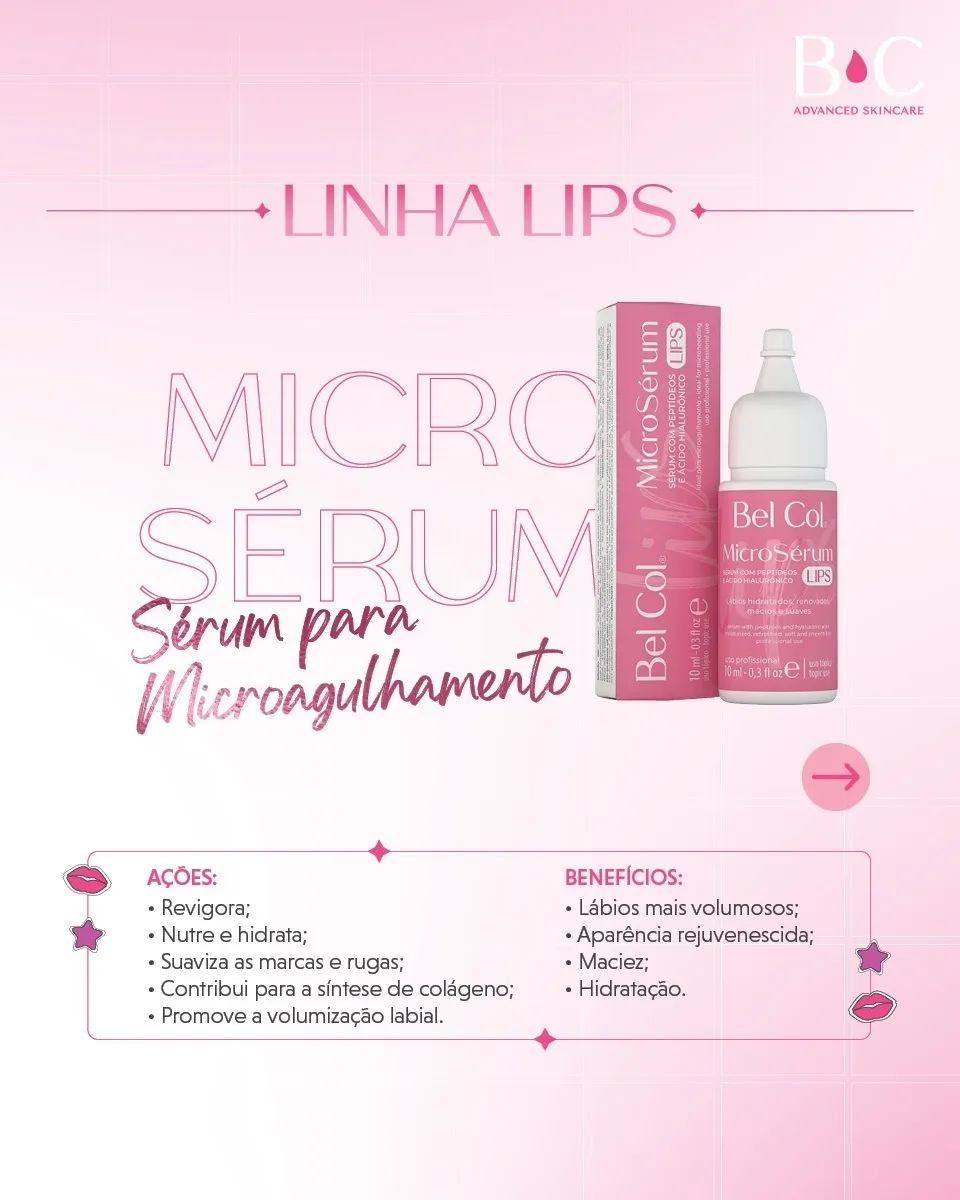 O Bel Col Micro Sérum Lips (10ml) é um sérum labial hidratante e renovador, formulado com Peptídeos e Ácido Hialurónico. Indicado para protocolos profissionais de cuidados labiais e para complementar procedimentos de microagulhamento labial, oferecendo conforto e acabamento mais uniforme.