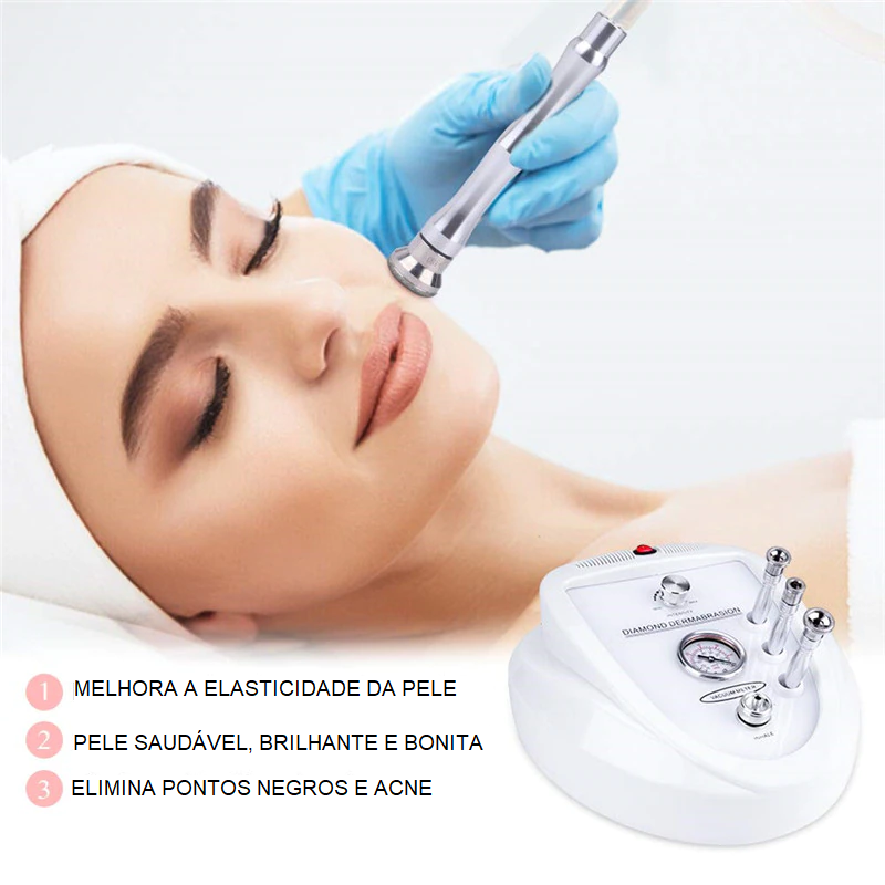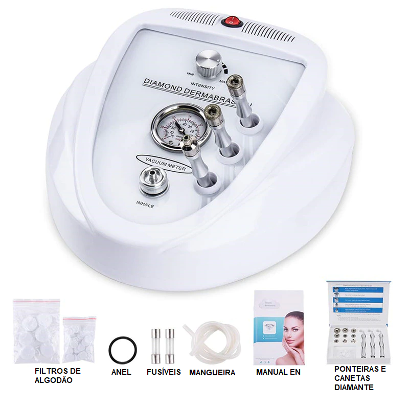 Equipamento de Dermoabrasão Vacuo 65 Watts com pontas de diamante para tratamentos de esfoliação controlados e não invasivos. Actua sobre as camadas mais superficiais da pele eliminando células mortas, rugas superficiais e impurezas.