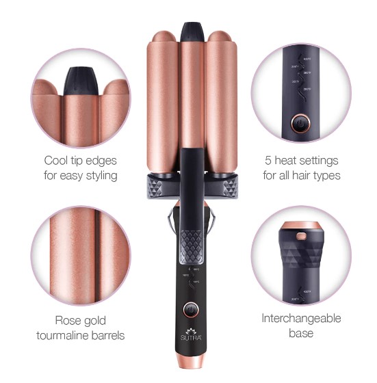 Um cone triplo em cerâmica com infusão de turmalina ouro rosa, que graças à sua tecnologia de aquecimento iónico infravermelho, preserva a humidade dos fios e sela a cutícula, reduzindo o frizz e a eletricidade estática.