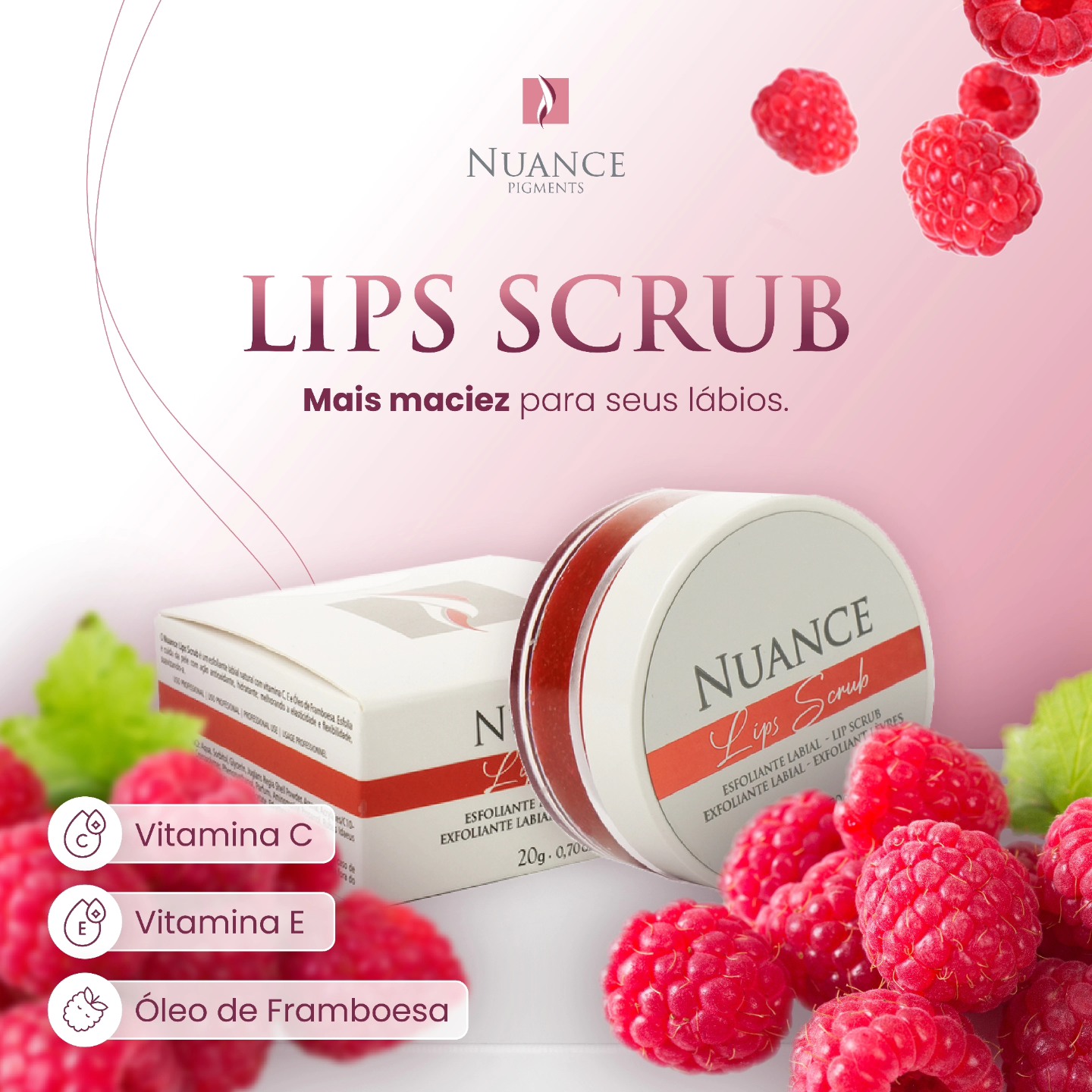 O Lips Scrub Nuance é um esfoliante labial formulado com vitamina C, vitamina E e óleo de framboesa, que proporciona uma esfoliação delicada enquanto hidrata e revitaliza os lábios.