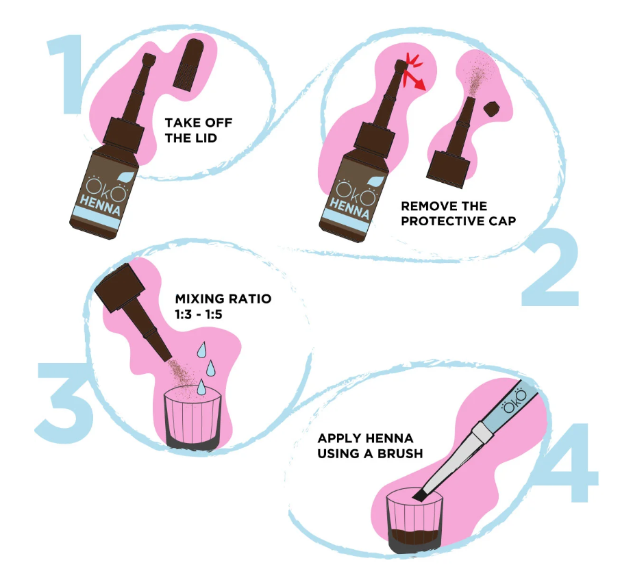 - Misture 1 parte de henna com 3 partes de água destilada (até 1:5).