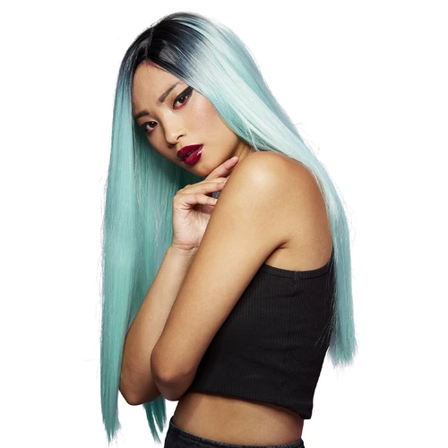 Peruca de comprimento longo, reta e estilizada pelo calor com divisão lateral e raiz escura na cor verde pastel Mar Nymph ™ Creamtone®.