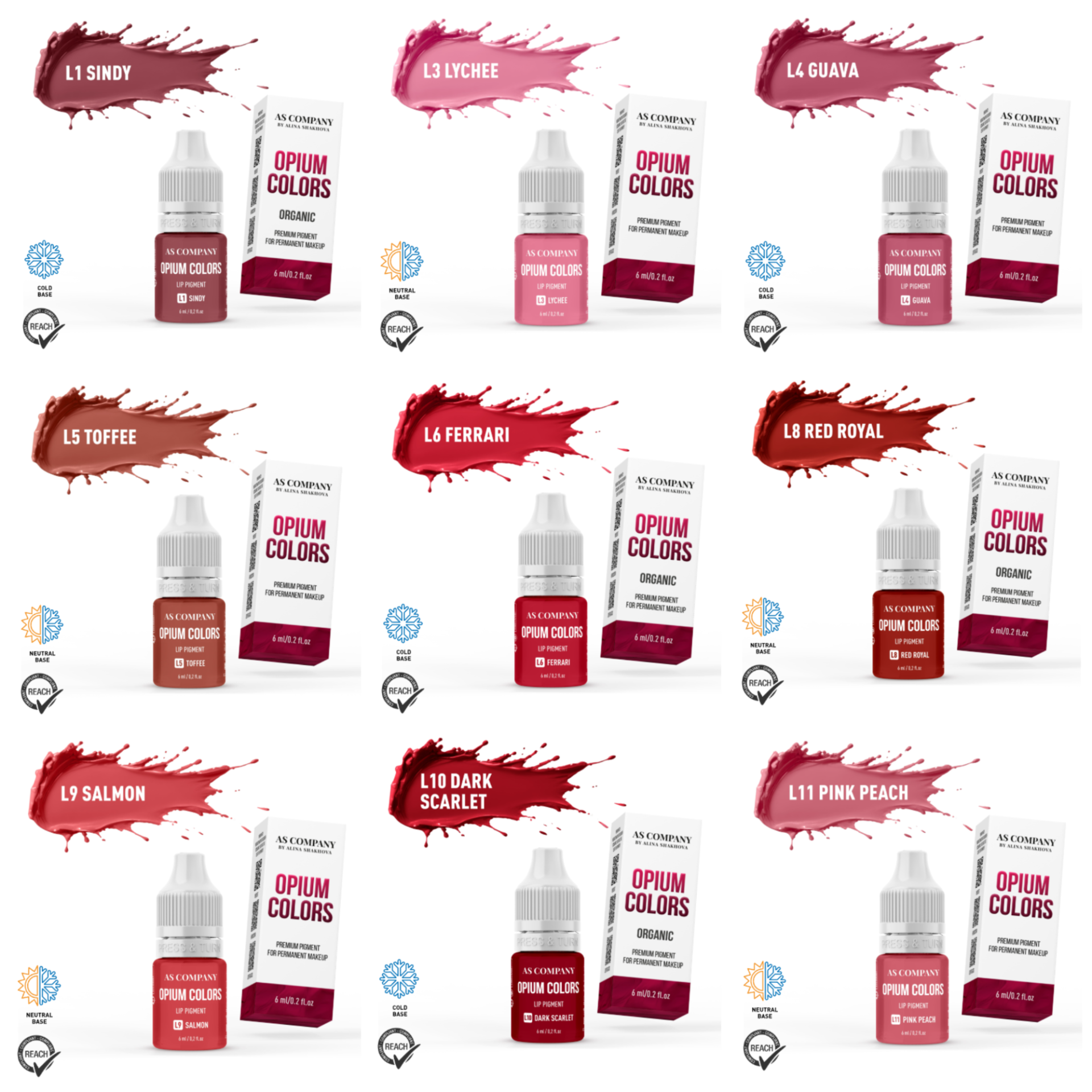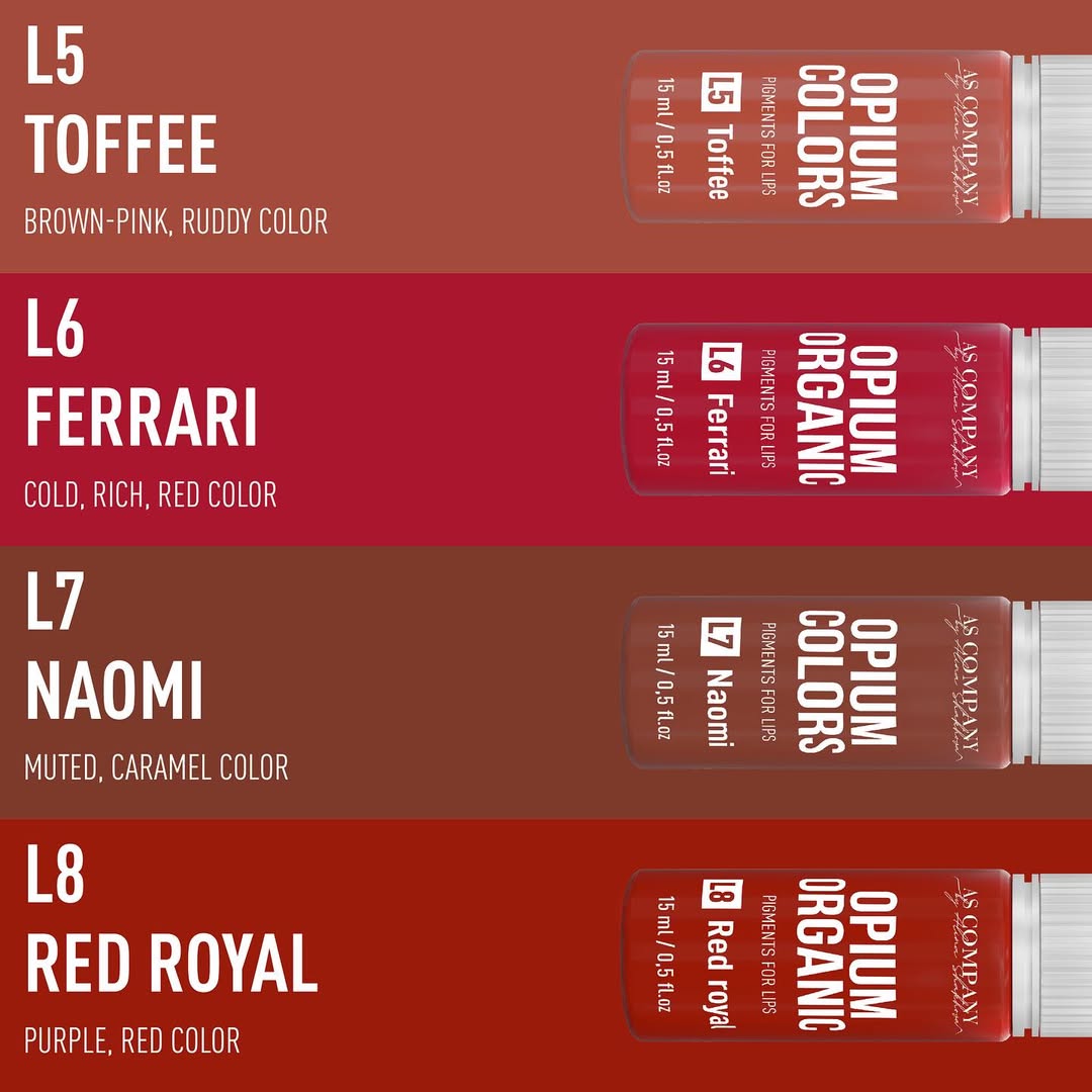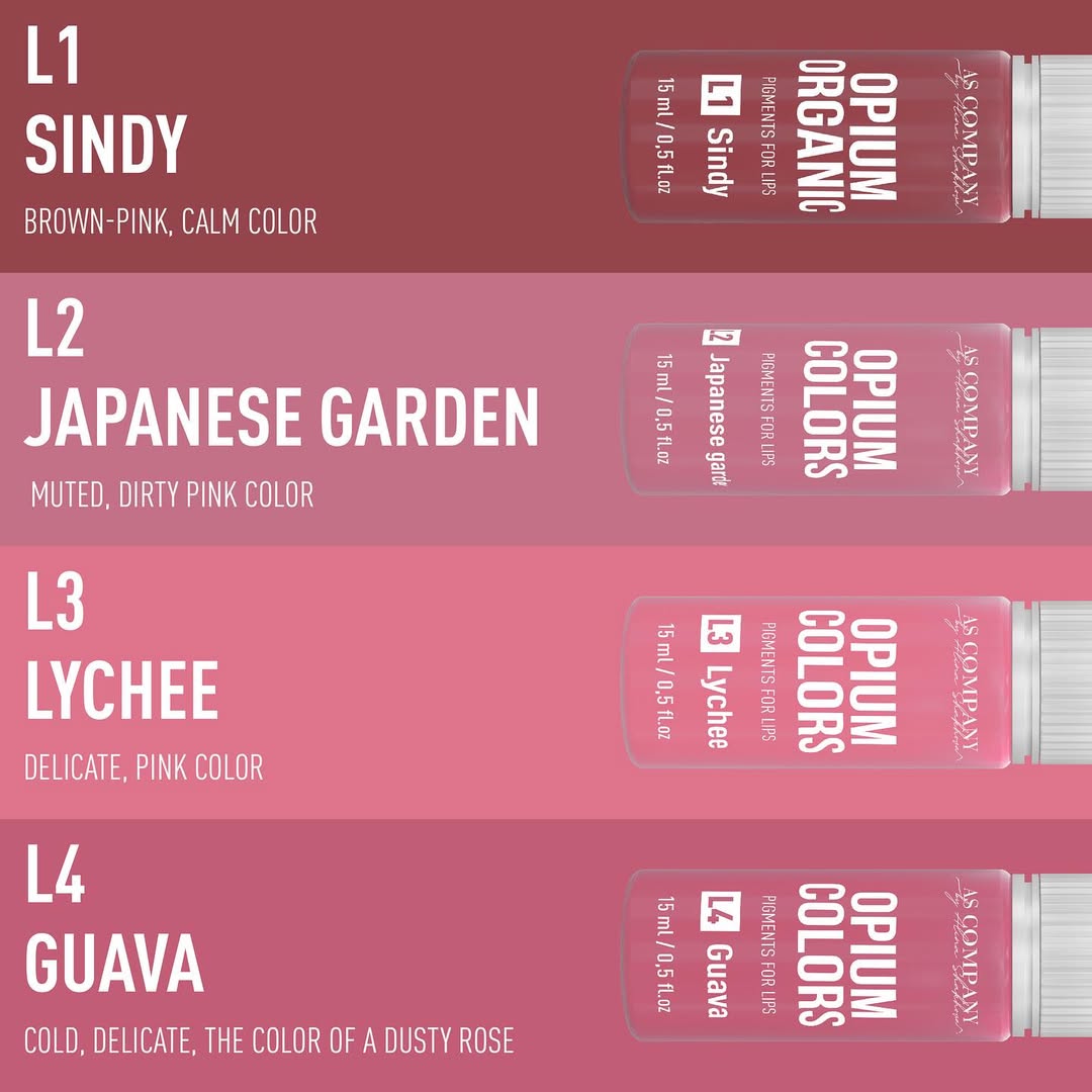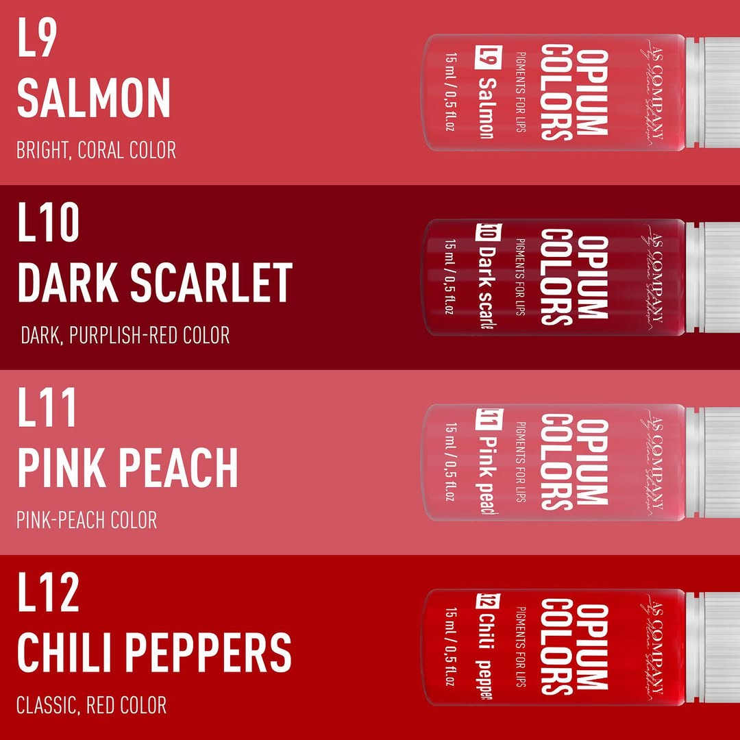 A linha Opium Colors é uma coleção premium de pigmentos para micropigmentação de lábios desenvolvida por Alina Shakhova para procedimentos profissionais de maquilhagem permanente (PMU).