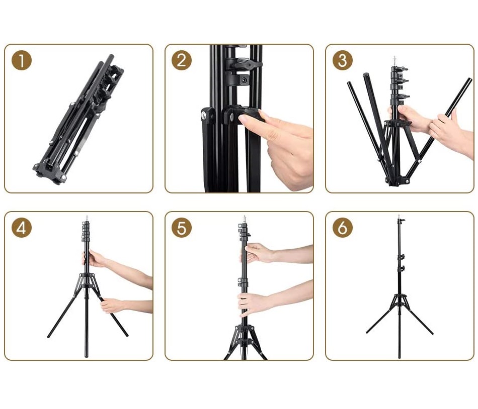 Tripé dobrável de 59": o tripé é extensível, leve e portátil, quando dobrado - 15,4", totalmente esticado - 59", finalmente adicione o anel de luz - aproximadamente 70 polegadas / 178 cm. O parafuso de 1/4" pode ajudá-lo a ligar a câmara digital, o suporte do telefone, o anel de luz, etc