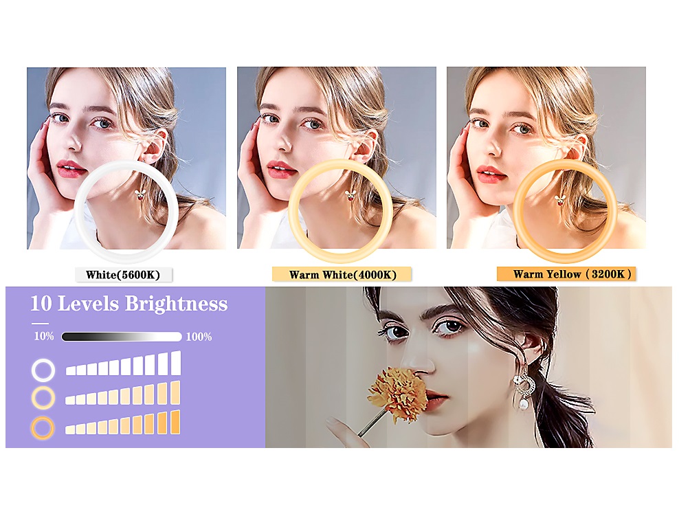 Anel de luz de 10 polegadas com controlo remoto: o anel de luz adota 120 peças contas avançadas de lâmpada LED, temperatura de cor de 3200 K-6500 K, sem cintilação, sem imagens fantasmas, sem ofuscar, a capa traseira de ABS proporciona uma sensação de toque fino, dissipação de calor perfeita efeito, permite que o seu anel de luz seja mais firme e duradouro