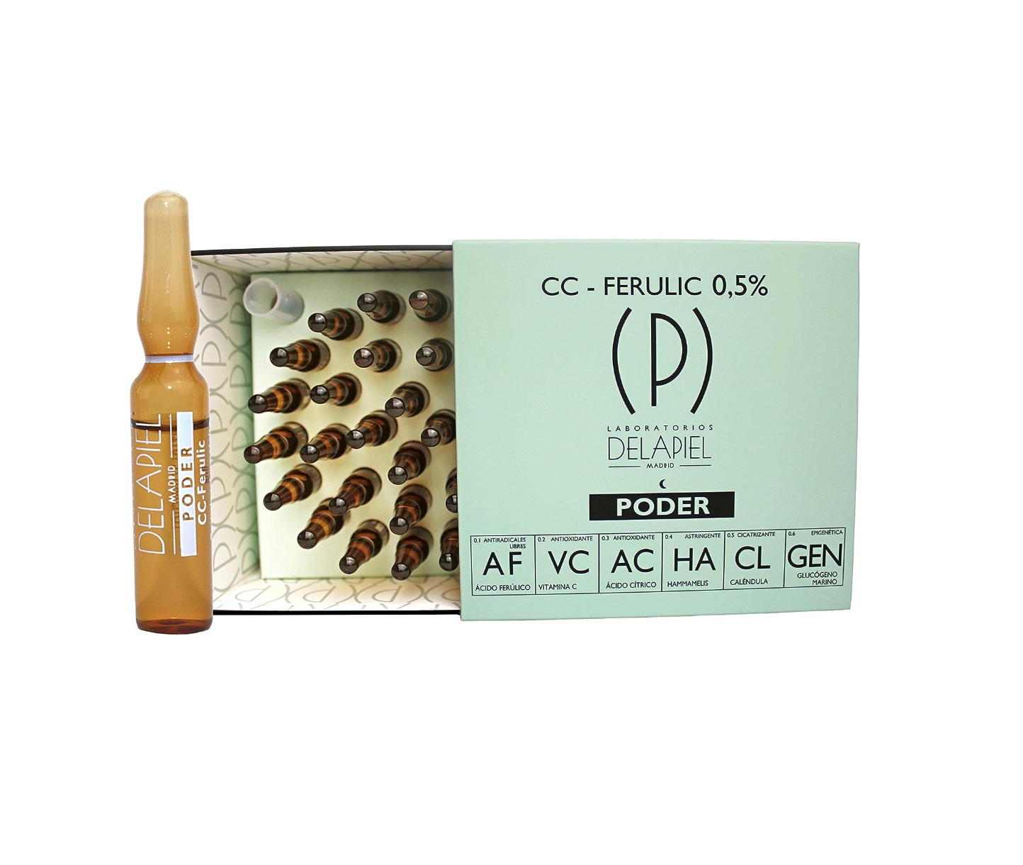 Ácido ferúlico: antioxidante de origem vegetal com propriedades antirradicais livres, protetor contra a radiação UV. Acelera a descamação da camada córnea, eliminando resíduos de pigmentação