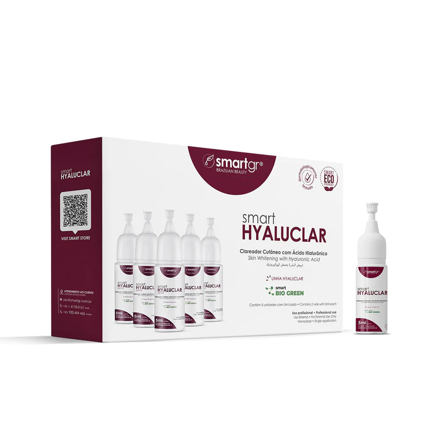 O Smart Hyaluclar Skin Pro da Smart GR é um fluido profissional desenvolvido para uniformizar o tom da pele, clarear marcas e manchas escuras, reduzir linhas finas e devolver luminosidade. A fórmula combina ativos clareadores de referência com hidratantes de alto desempenho para um resultado visível, progressivo e duradouro.