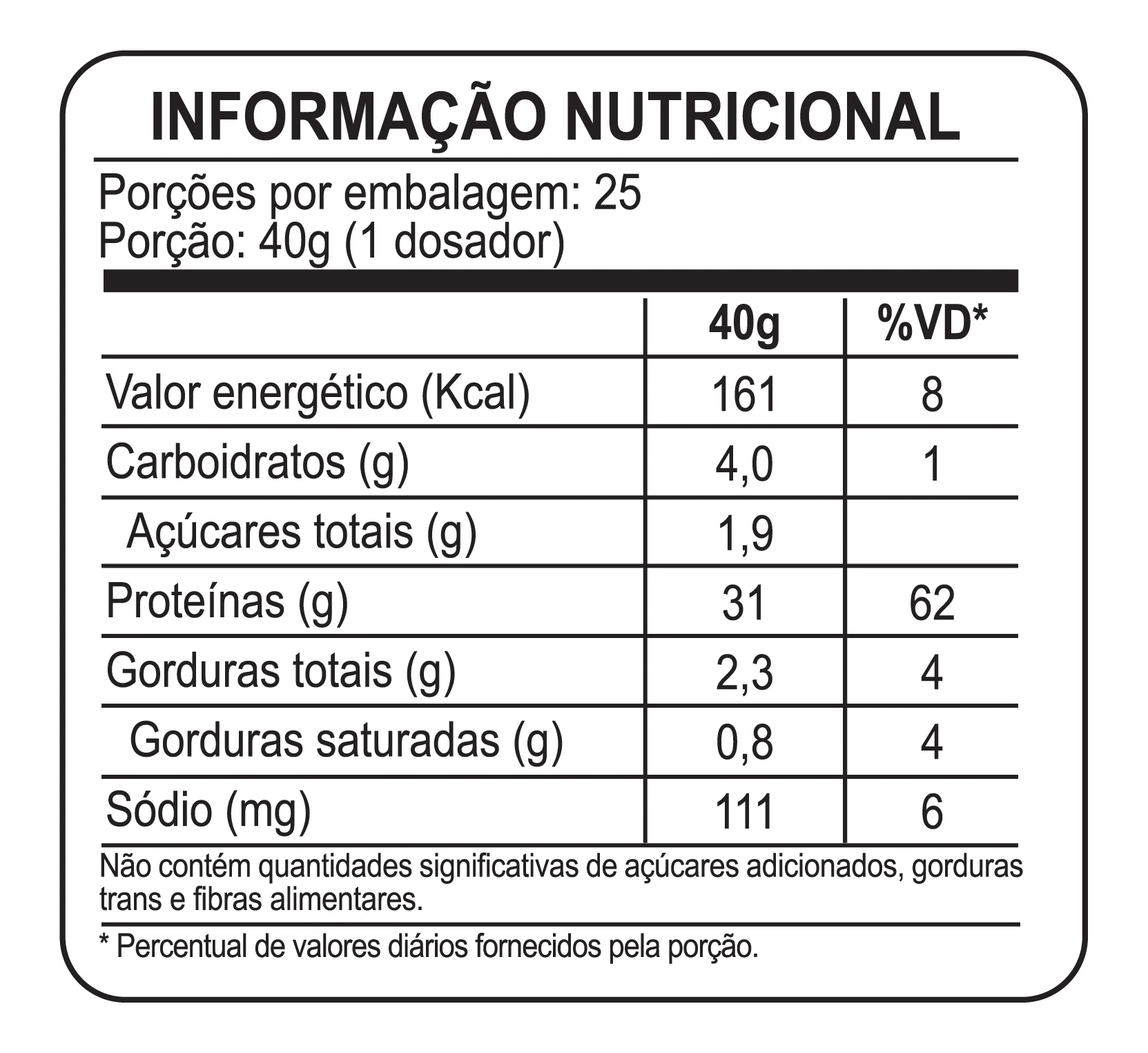 Proteína concentrada de soro do leite, proteína isolada de soro do leite, proteína hidrolisada de soro do leite, aromatizante, espessante goma xantana e edulcorante sucralose. ALÉRGICOS: CONTÉM DERIVADOS DE LEITE E SOJA. CONTÉM LACTOSE. NÃO CONTÉM GLÚTEN