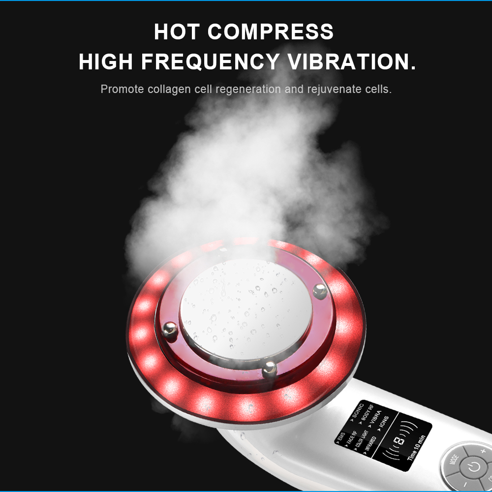 Tais como ultrassônico, EMS, luz de cor, aquecimento infravermelho, massagem de vibração, iões negativos e RF.