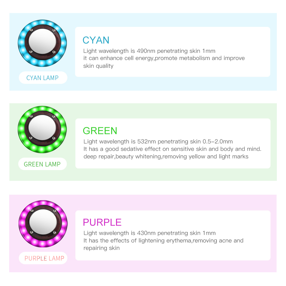 - Luz de ciano(490nm): Pele penetrante 1mm. Melhorar a energia celular, promover o metabolismo e melhorar a qualidade da pele.